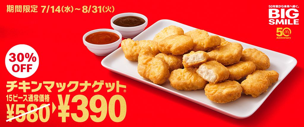 マクドナルド 8月は4週連続キャンペーン 第2回 今日は月曜 ナゲッツ曜日は チキンマックナゲット からプレゼント この投稿に ナゲッツ曜日 をつけてリプライすると 抽選で1 000円分のマックカードをプレゼント 今なら 15ピース390円